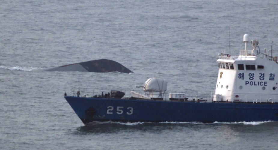 首爾當(dāng)?shù)貢r間26日晚9點45分許,在韓國西部海域執(zhí)行警戒任務(wù)的天安艦(1200噸級)因不明原因事故,船底被炸開洞,船尾開始下沉。天安艦上共有104人,韓國巡邏艇和直升飛機迅速展開救援行動,事發(fā)5小時后,官員稱已救出58人,但因為強風(fēng)和夜幕,救援行動進展緩慢,其它人員仍下落不明。圖為一艘救援船靠近幾近沉沒的韓國海軍“天安艦”。