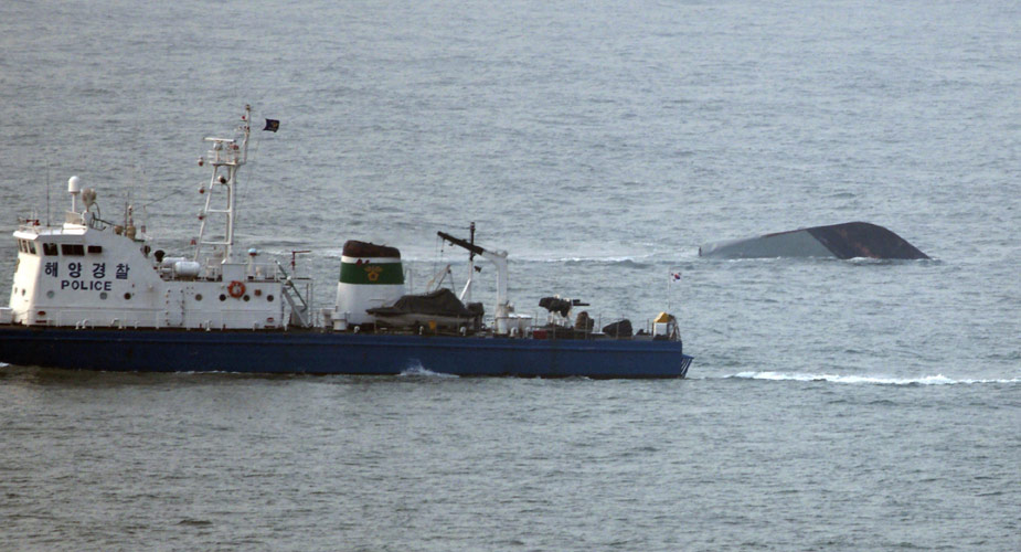 首爾當(dāng)?shù)貢r(shí)間26日晚9點(diǎn)45分許,在韓國(guó)西部海域執(zhí)行警戒任務(wù)的天安艦(1200噸級(jí))因不明原因事故,船底被炸開(kāi)洞,船尾開(kāi)始下沉。天安艦上共有104人,韓國(guó)巡邏艇和直升飛機(jī)迅速展開(kāi)救援行動(dòng),事發(fā)5小時(shí)后,官員稱已救出58人,但因?yàn)閺?qiáng)風(fēng)和夜幕,救援行動(dòng)進(jìn)展緩慢,其它人員仍下落不明。圖為一艘救援船靠近幾近沉沒(méi)的韓國(guó)海軍“天安艦”。