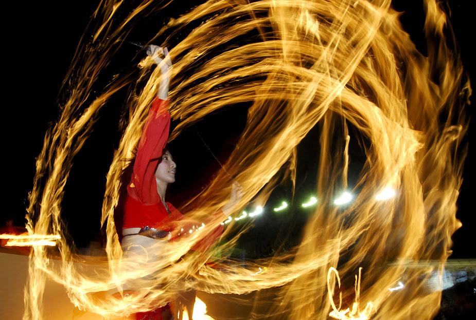 當?shù)貢r間3月25日,在菲律賓馬尼拉,一名舞者在火焰中“熱舞”。