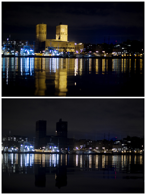 由世界自然基金會發(fā)起的“地球一小時”環(huán);顒27日20點30分按照時區(qū)依次在全球數(shù)千個城市展開。圖為挪威奧斯陸市政廳在熄燈前和熄燈后的景色。