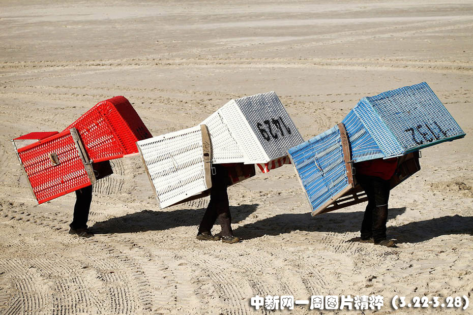 3月23日,德國氣溫持續(xù)升高,工人頂著柳條椅沿海灘前進(jìn)。