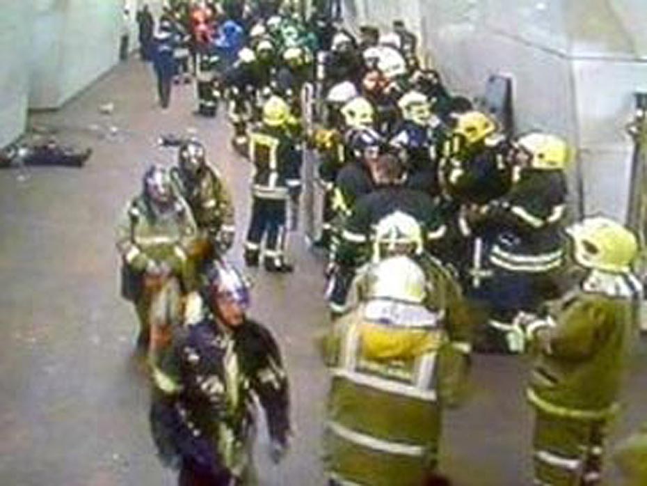 圖為發(fā)生爆炸事件的地鐵監(jiān)視器所拍攝的救援人員正在準(zhǔn)備進入爆炸現(xiàn)場。