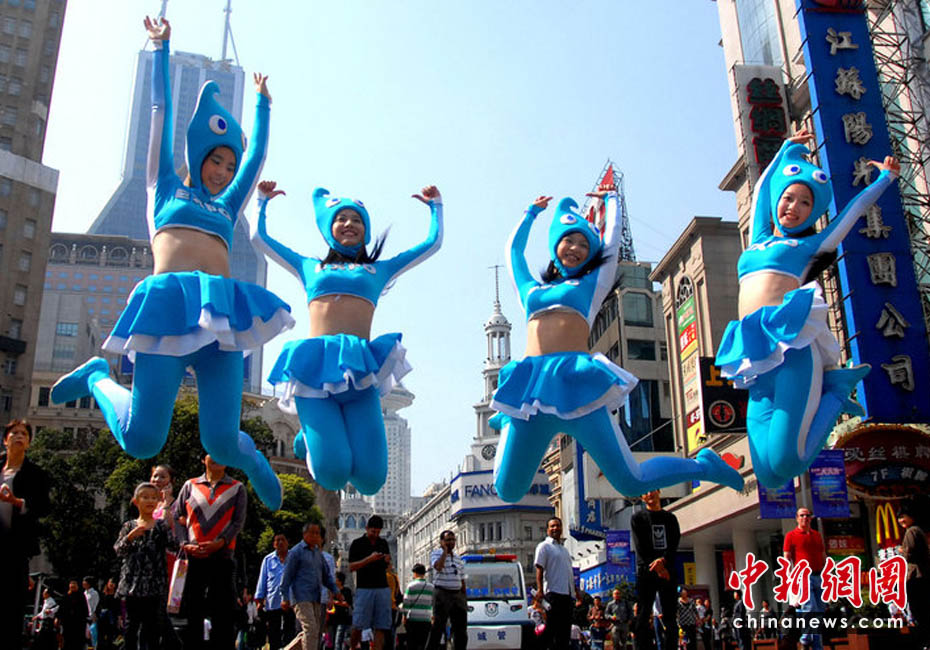 上海南京路步行街,幾名“海寶”打扮的少女出現(xiàn)在街頭,引起不少路人和游客的觀看。這是上海商貿(mào)旅游學(xué)校的女學(xué)生扮演的“歡樂海寶”,她們參加演出后,在街頭通過生動(dòng)的形體語(yǔ)言來(lái)展示世博會(huì)的可愛吉祥物--“海寶”。 楊毅CFP