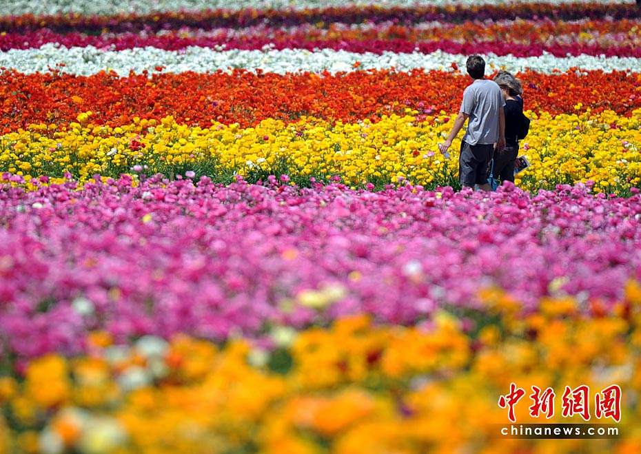 美國加利福尼亞州圣迭戈的卡爾斯巴德花田近日繁花盛開,姹紫嫣紅的花朵整齊地鋪滿在五十英畝的土地上,一望無垠的花海,美不勝收。圖片來源:中國新聞網(wǎng)