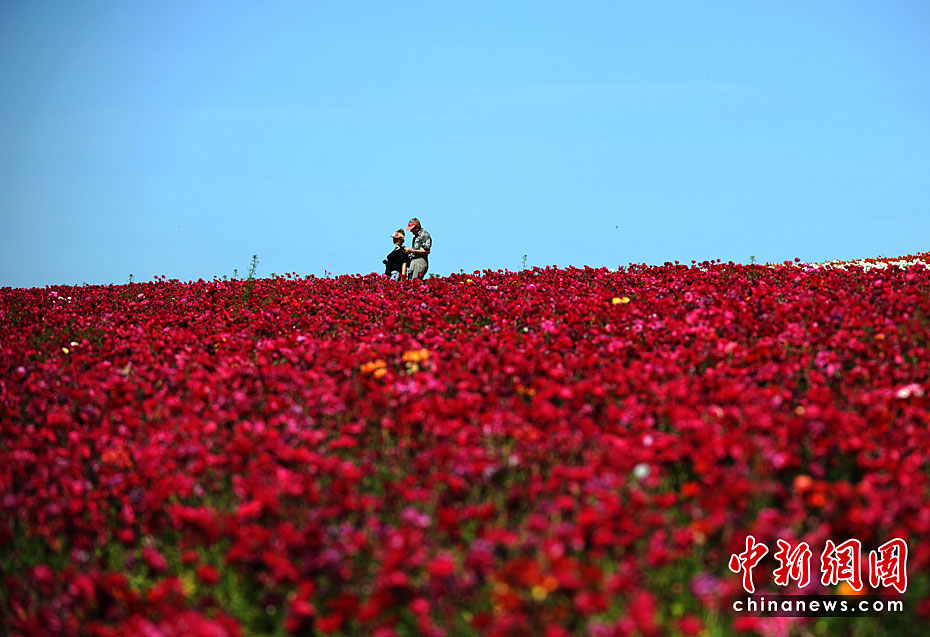美國加利福尼亞州圣迭戈的卡爾斯巴德花田近日繁花盛開,姹紫嫣紅的花朵整齊地鋪滿在五十英畝的土地上,一望無垠的花海,美不勝收。圖片來源:中國新聞網(wǎng)