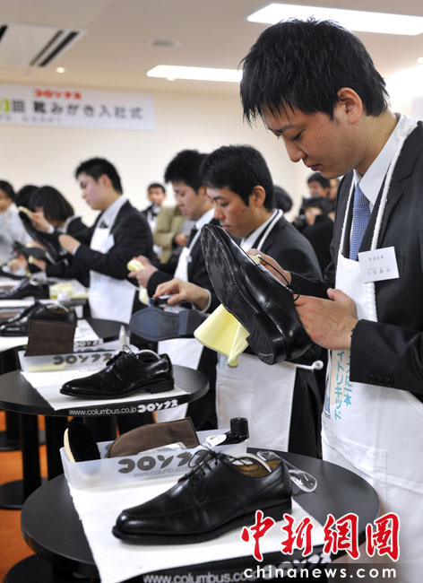 4月1日,日本一家鞋油廠新員工在入職儀式上為老員工擦鞋。圖片來源:中國新聞網(wǎng)