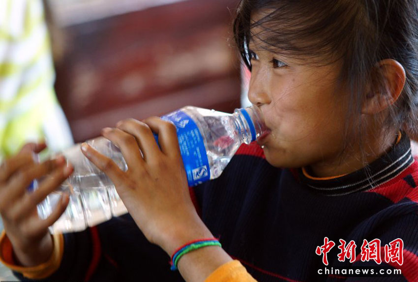 上課時,孩子們喝在桌子上放著的礦泉水,現(xiàn)在他們每天發(fā)兩瓶水,很多孩子省下來一半帶回家給家人。沙浪 攝