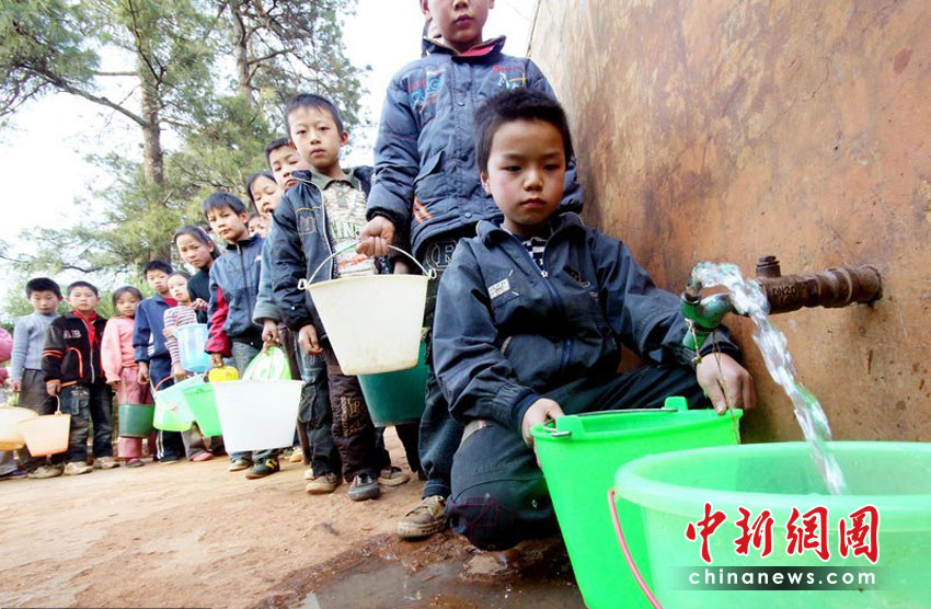 送水車將水送入水窯,晚飯后是孩子們排隊(duì)取水的時(shí)間。沙浪 攝(CFP)