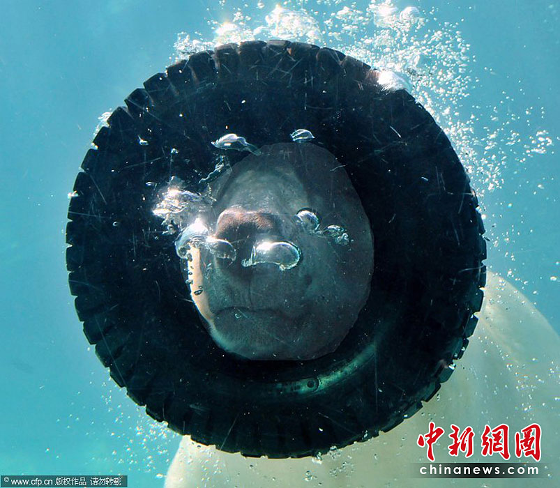 美國Asheboro北卡羅來納動物園一頭名叫威利的北極熊可是個“活寶”。任何一個可用的東西都能成為它在鏡頭前“耍寶”的玩具。圖片來源:CFP