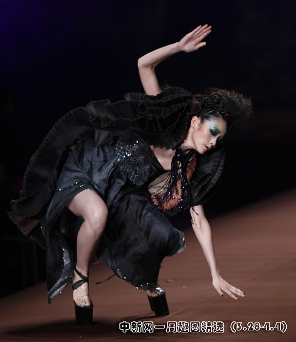 3月29日晚,旭化成·中國(guó)時(shí)裝設(shè)計(jì)師創(chuàng)意大獎(jiǎng)張義超作品發(fā)布會(huì)在北京舉行,一名模特在T型臺(tái)上“失足”摔倒。圖片來源:中國(guó)新聞網(wǎng)>>點(diǎn)擊觀看詳細(xì)內(nèi)容