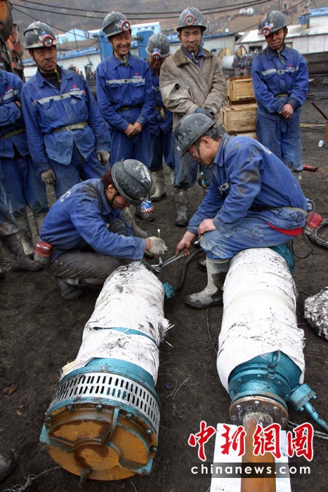 3月29日上午,山西華晉焦煤有限責任公司王家?guī)X煤礦透水事故搶險工作正在緊張進行中。為救援被困礦工,多方支援的搶險器材、礦山救護隊已經(jīng)陸續(xù)抵達現(xiàn)場。圖為即將組裝完畢的水泵。中新社發(fā) 張云 攝