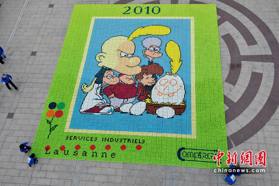 4月4日,瑞士洛桑的廣場上,人們用6.6萬枚彩蛋拼出一畫巨大的卡通圖像,用來為患癌癥兒童籌集善款。圖片來源:中國新聞網(wǎng)