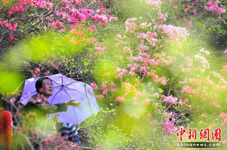 2010年4月4日,湖北武漢市黃坡區(qū)云霧山萬畝杜鵑花競(jìng)相怒放,迎接八方游客踏青賞花。宋建春/CFP