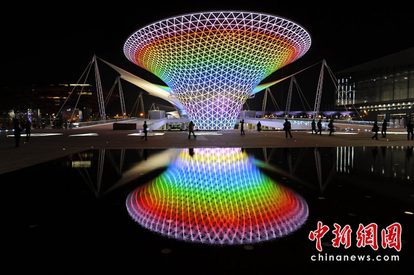 4月8日,上海世博會園區(qū)各大洲國家展館的建設(shè)和布展絕大多數(shù)已經(jīng)進(jìn)入尾聲。圖為世博軸太陽谷在水中的夜景。梁臻 攝