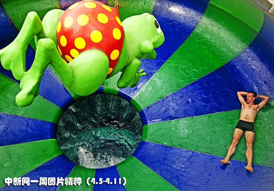 4月5日周一,在荷蘭瓦森納Duinrell游樂(lè)園中,一位游客正躺在一個(gè)名為Tikibath的泳池中享受戲水的樂(lè)趣。