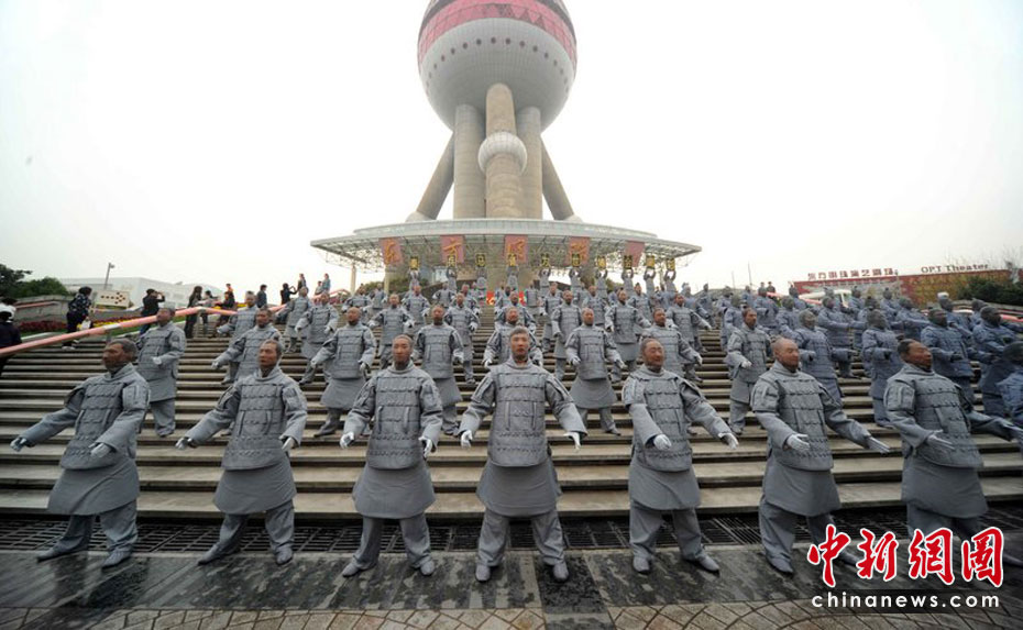 來自兵馬俑故鄉(xiāng)的百人表演隊(duì)伍,身著灰色的兵馬俑服裝,以鏗鏘的節(jié)奏、雄壯的氣勢(shì),在上海南京東路步行街和東方明珠廣場游演。