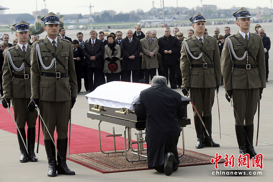 4月10日,卡欽斯基乘坐專(zhuān)機(jī)從華沙飛往俄羅斯斯摩棱斯克市,參加卡廷森林事件70周年紀(jì)念活動(dòng)。途中飛機(jī)在斯摩棱斯克“北方”軍用機(jī)場(chǎng)附近降落時(shí)失事,共造成包括卡欽斯基夫婦及眾多政府高官在內(nèi)的96人死亡。慘劇發(fā)生后,舉世震驚。圖為卡欽斯基的孿生兄弟在遺體前跪拜。