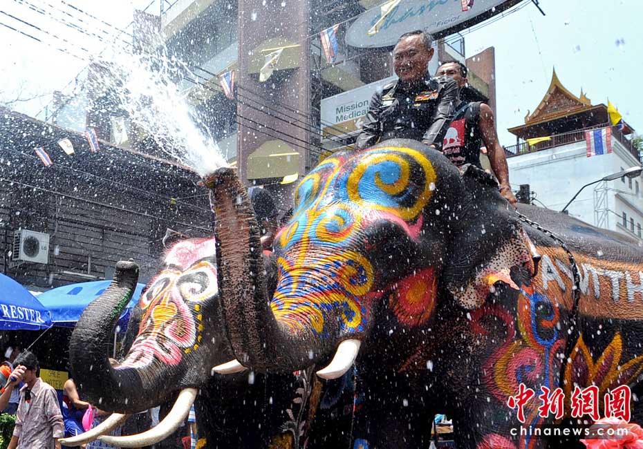 4月12日,泰國迎來一年一度的潑水節(jié),在拷桑路旅游區(qū)人們用水槍與大象“互噴”希望為對方送上祝福同時慶祝泰國新年。圖片來源:中國新聞網(wǎng)