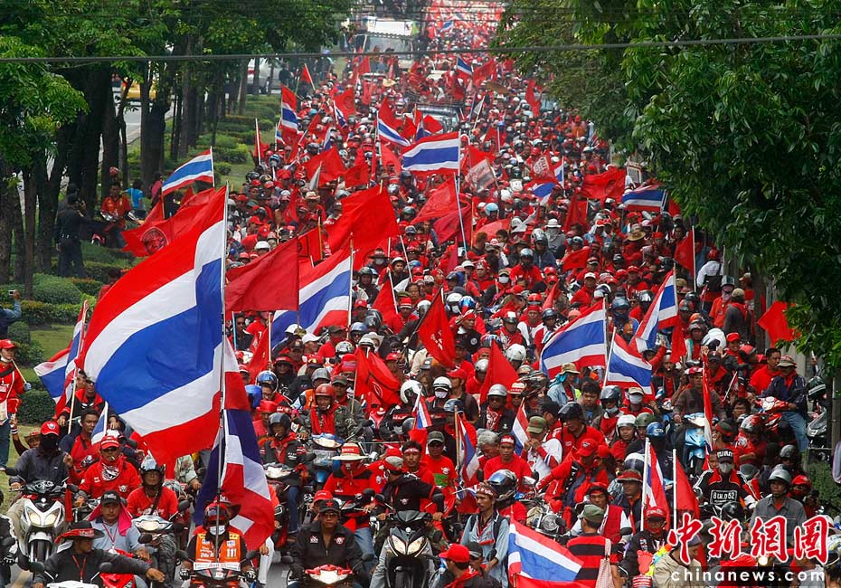 當(dāng)?shù)貢r間4月12日,泰國紅衫軍在曼谷市區(qū)抬著棺材舉行游行,借此向政府施壓促阿披實下臺。此前紅衫軍示威者與軍警發(fā)生沖突,造成21人死亡。圖片來源:中國新聞網(wǎng)