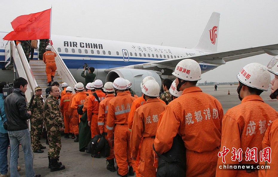 圖為4月14日18時(shí)02分和18時(shí)08分,國(guó)航西南分公司執(zhí)行緊急救援包機(jī)的一架空中客車A319和一架波音757飛機(jī)共搭載302名消防救災(zāi)人員和搜救設(shè)備從成都雙流機(jī)場(chǎng)起飛,火速趕往西寧,將前往青海玉樹7.1級(jí)地震震區(qū)救援。中新社發(fā) 易世忠 攝