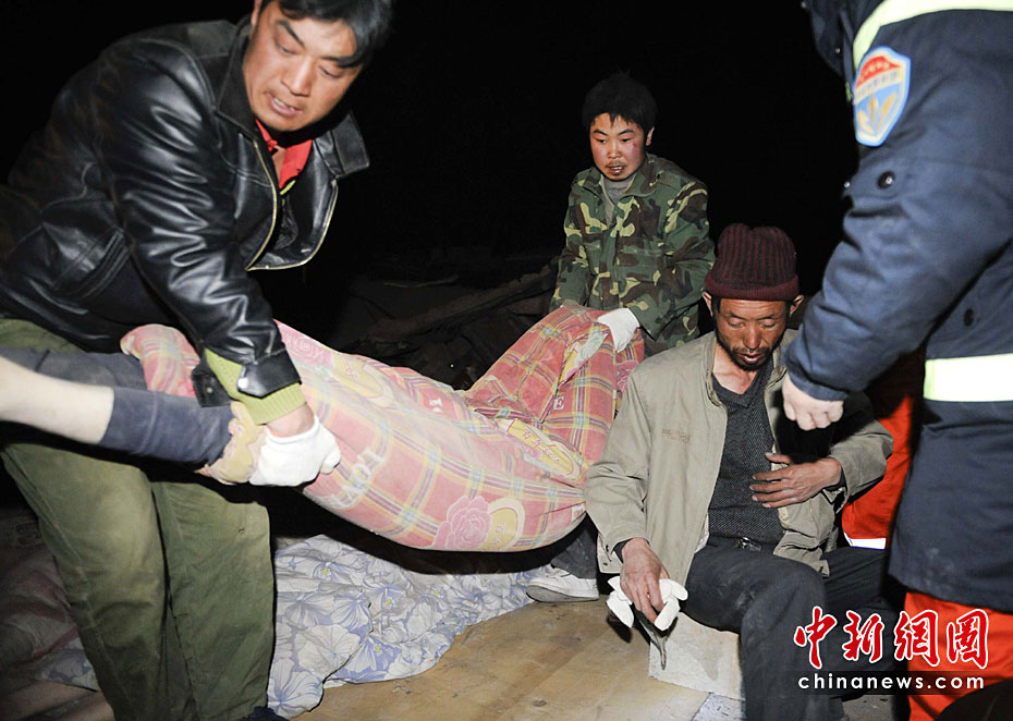 圖為4月15日凌晨1時,玉樹縣的民眾在中國國際救援隊隊員的幫助下清理遇難者遺體。中新社發(fā) 廖攀 攝