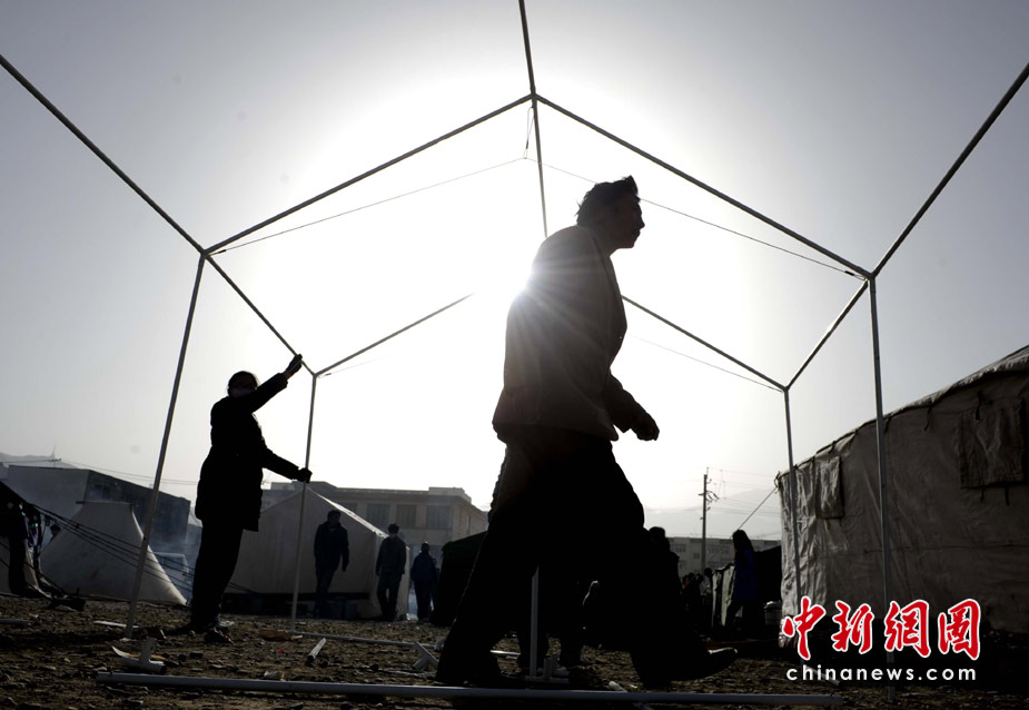 4月15日,青海玉樹縣體育場的地震災民安置點內(nèi),玉樹地震災民正在積極自建抗震帳棚。中新社發(fā) 廖攀 攝