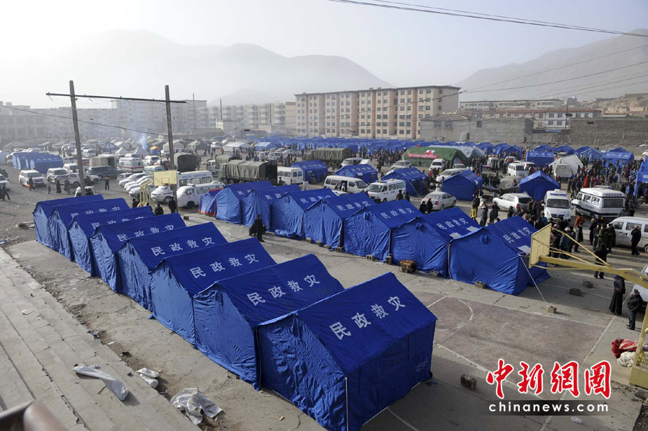 4月15日,青海玉樹縣體育場的地震災(zāi)民安置點(diǎn)帳篷林立。目前青海省玉樹州“4·14”地震造成的死亡人數(shù)已上升至589人,10萬災(zāi)民需要需要轉(zhuǎn)移安置。中新社發(fā) 廖攀 攝
