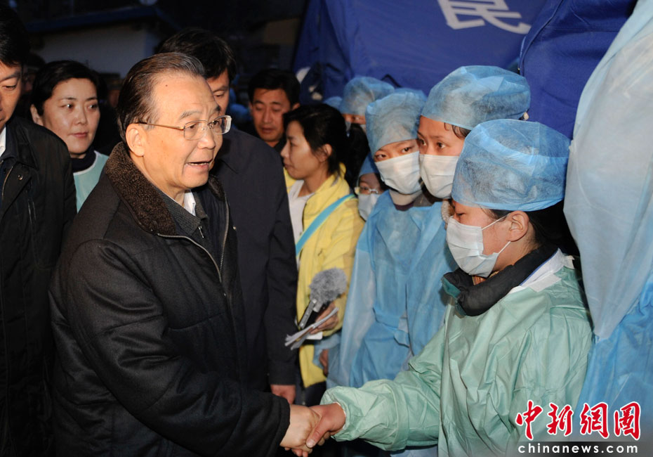4月15日20時(shí),中國(guó)國(guó)務(wù)院總理溫家寶來(lái)到青海省玉樹縣玉樹自治州醫(yī)院看望受災(zāi)民眾和醫(yī)務(wù)人員。中新社發(fā) 廖攀 攝