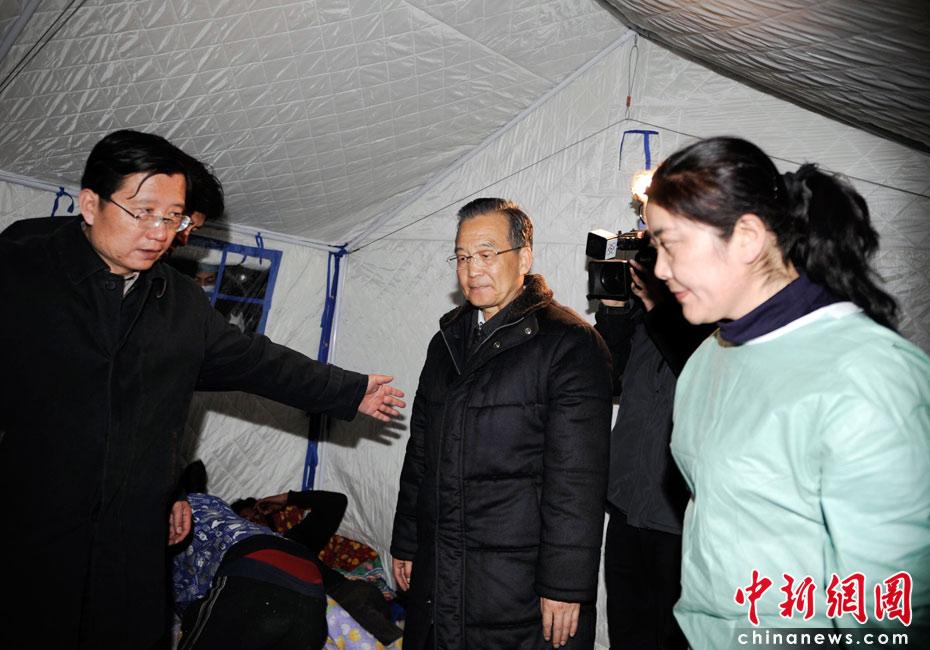 4月15日20時(shí),中國國務(wù)院總理溫家寶來到青海省玉樹縣玉樹自治州醫(yī)院看望受災(zāi)民眾。溫總理看望完受災(zāi)民眾后表情凝重。中新社發(fā) 廖攀 攝