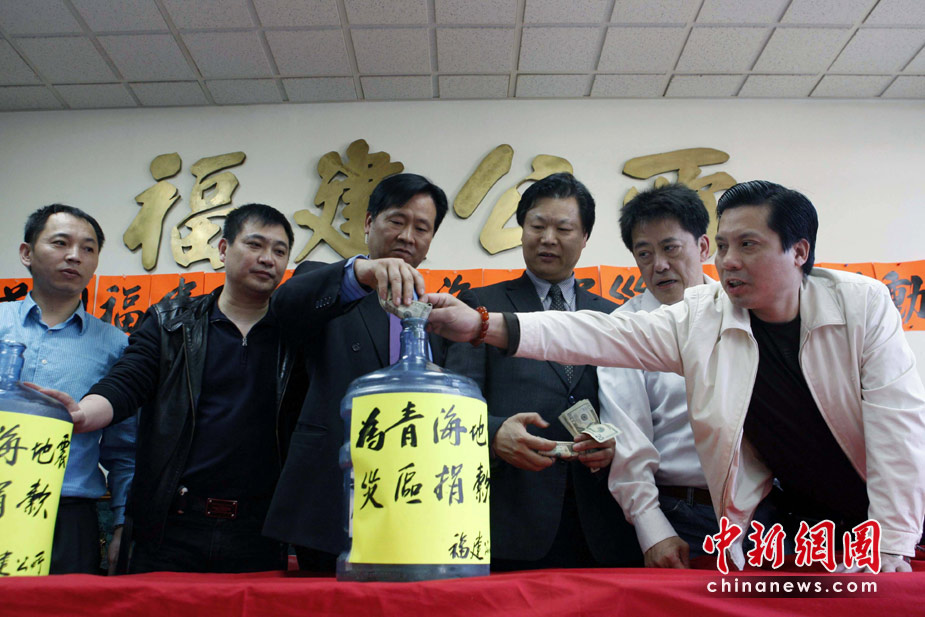 青海玉樹發(fā)生地震以來,美國各地的華人華僑齊伸援手,紐約的華人社團(tuán)聯(lián)合總會15日呼吁下屬數(shù)百社團(tuán)為玉樹災(zāi)區(qū)捐款,并在華埠主要街道沿街設(shè)立捐款箱。圖為紐約福建公所捐款現(xiàn)場,華人華僑們在不到幾分鐘的時間內(nèi),就為青海玉樹災(zāi)區(qū)捐款近5000美元。中新社發(fā) 魏晞 攝