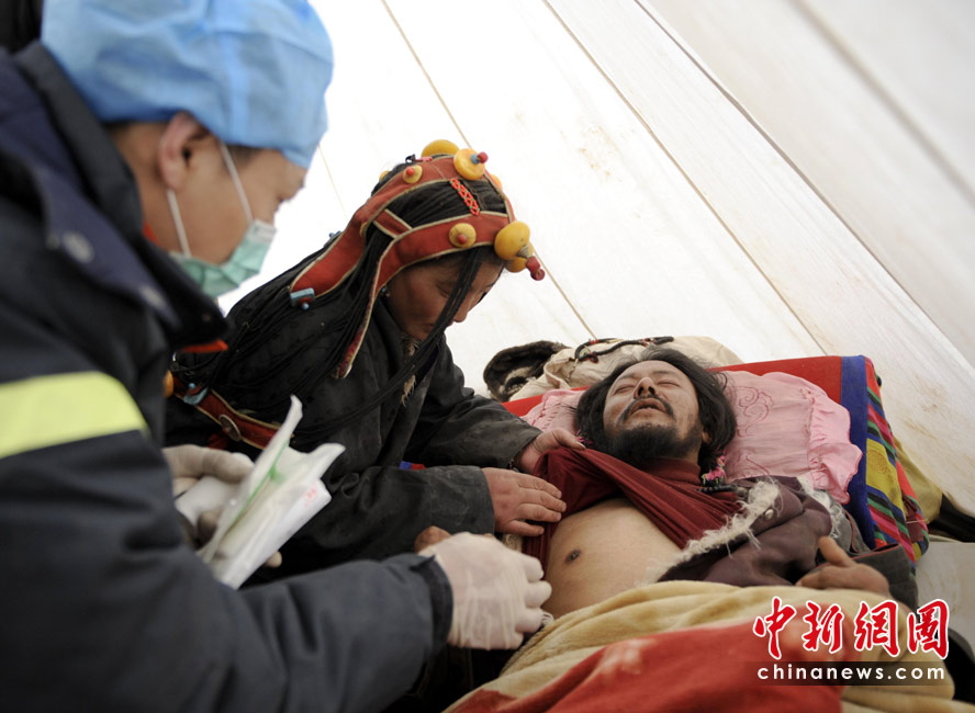 4月16日,青海玉樹(shù)體育場(chǎng)地震災(zāi)民安置點(diǎn),武警醫(yī)院醫(yī)療隊(duì)醫(yī)務(wù)人員來(lái)到東周丹增家的帳篷里為傷者檢查身體。中新社發(fā) 廖攀 攝