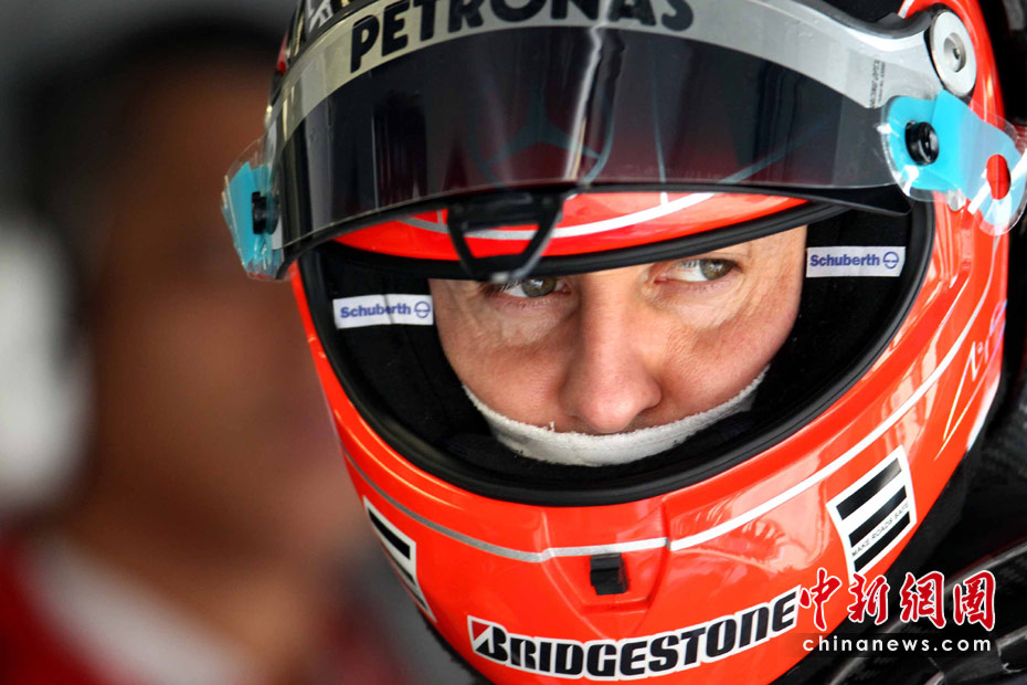 4月16日,2010國際汽聯(lián)F1世界錦標賽上海站在上海國際賽車場開始車手第一、第二次練習賽。圖為代表梅賽德斯GP車隊出戰(zhàn)的老車王、德國車手舒馬赫重回上海賽道。 中新社記者 任晨鳴 攝