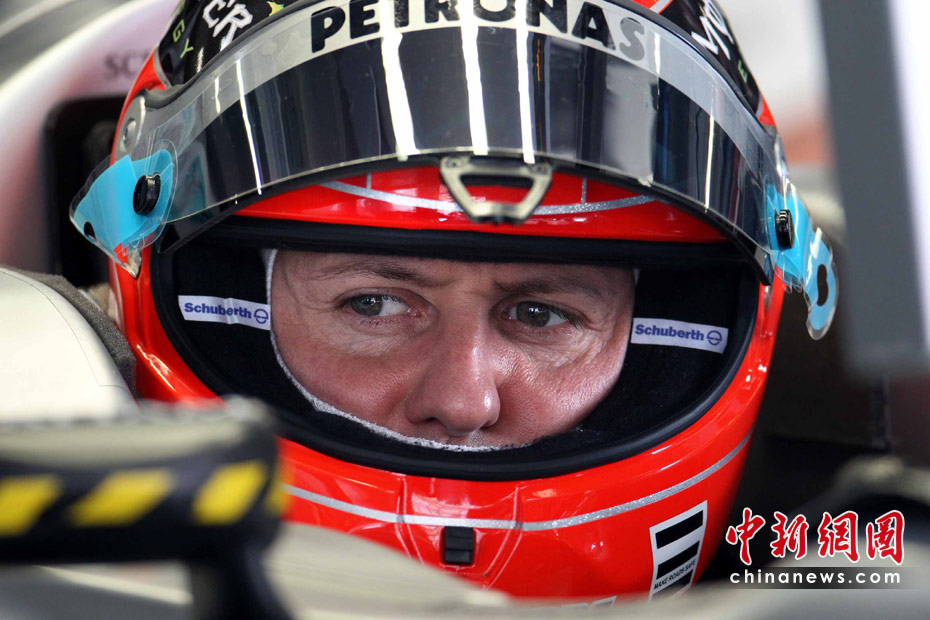 4月16日,2010國際汽聯(lián)F1世界錦標(biāo)賽上海站在上海國際賽車場開始車手第一、第二次練習(xí)賽。圖為代表梅賽德斯GP車隊出戰(zhàn)的老車王、德國車手舒馬赫重回上海賽道。 中新社記者 任晨鳴 攝