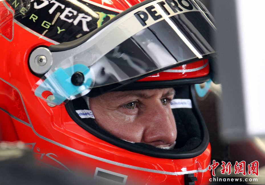 4月16日,2010國際汽聯(lián)F1世界錦標(biāo)賽上海站在上海國際賽車場(chǎng)開始車手第一、第二次練習(xí)賽。圖為代表梅賽德斯GP車隊(duì)出戰(zhàn)的老車王、德國車手舒馬赫重回上海賽道。 中新社記者 任晨鳴 攝
