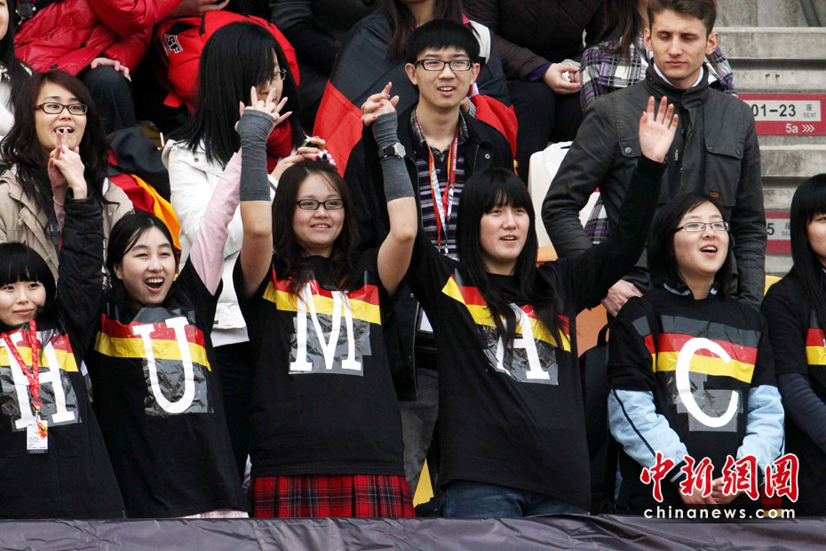4月16日,2010國際汽聯(lián)F1世界錦標(biāo)賽上海站在上海國際賽車場開始車手第一、第二次練習(xí)賽。代表梅賽德斯GP車隊出戰(zhàn)的老車王、德國車手舒馬赫重回上海賽道。 圖為舒馬赫的中國女粉絲在看臺上為偶像助威。 中新社記者 任晨鳴 攝