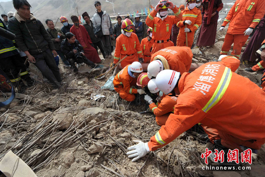 4月16日,青海玉樹地震救援進(jìn)入第三天,來自蘭州軍區(qū)、山東消防特勤、重慶特勤、廣東邊防總隊(duì)、云南邊防總隊(duì)、青海民兵等搜救隊(duì)連續(xù)搜救,幸存者奇跡生還。中新社發(fā) 陳文 攝