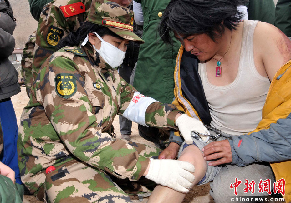 4月16日上午,廣東邊防總隊(duì)抗震救災(zāi)醫(yī)療隊(duì)在青海玉樹州結(jié)古鎮(zhèn)民族師范學(xué)院廣場(chǎng)設(shè)立救治點(diǎn),當(dāng)日救助地震災(zāi)區(qū)傷員200多名。中新社發(fā) 陳森陽(yáng) 攝
