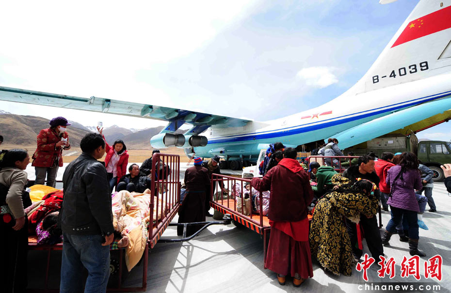 4月16日15時,青海玉樹機場,149名藏族重傷員準備乘坐廣空運輸航空兵某師兩架伊爾-76型運輸機飛往格爾木機場。中新社發(fā) 沈玲 攝