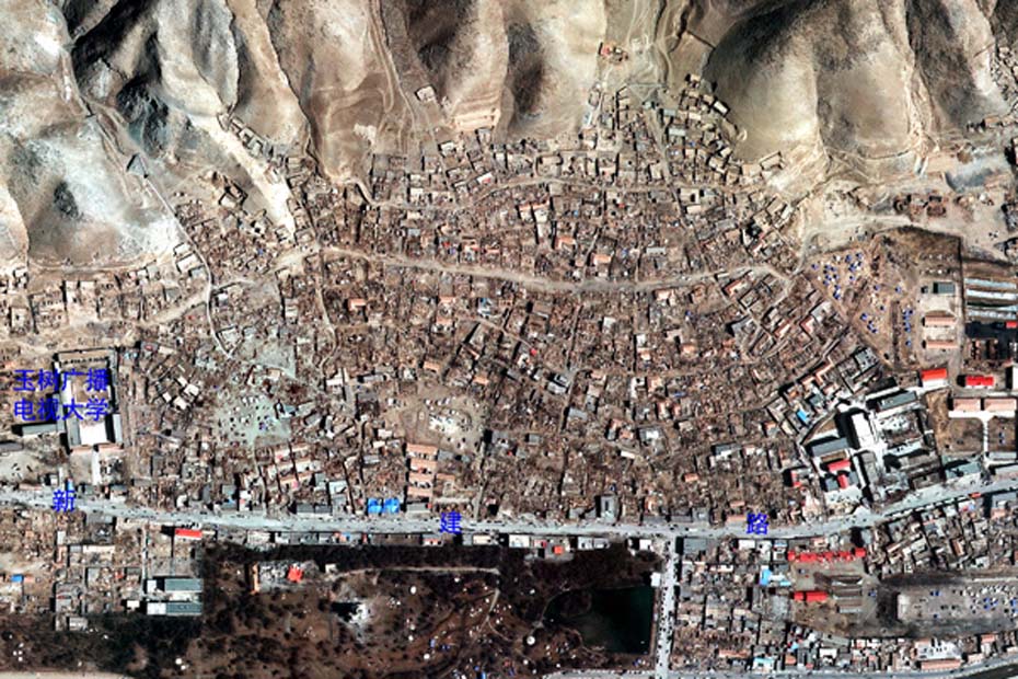 利用對(duì)地觀測(cè)中心2010年4月16日獲取的高分辨率航空遙感數(shù)據(jù),提取出玉樹州結(jié)古鎮(zhèn)城區(qū)范圍內(nèi)地震破壞最嚴(yán)重或典型地區(qū),使之與GoogleEarth中相應(yīng)位置的震前遙感衛(wèi)星數(shù)據(jù)進(jìn)行對(duì)比,直觀展現(xiàn)結(jié)古鎮(zhèn)在此次地震中的受影響程度。圖片來源:中國(guó)科學(xué)院