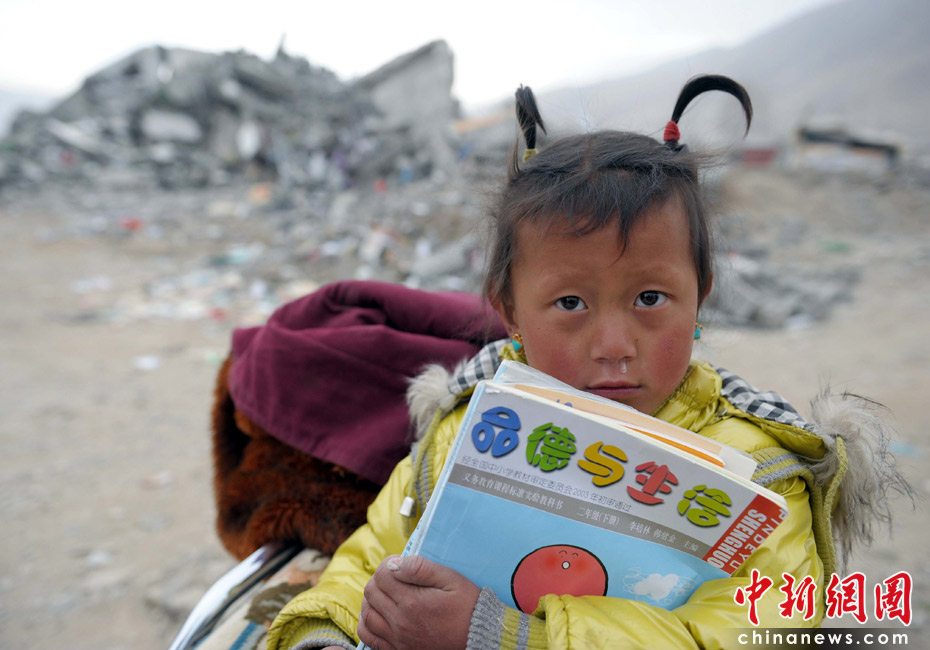 4月17日,一位上小學(xué)二年級的女童緊抱著自己的課本,站在震后的廢墟前。4月17日上午,青海省民政廳廳長更陽向媒體發(fā)布了一系列安撫救濟措施,災(zāi)民生活補助按每人每天15元,每一個死亡人員家庭補助8000元,“三孤”指孤老、孤殘、孤兒補助每人每月1000元,孤兒補助到18歲止。中新社發(fā) 陳文 攝