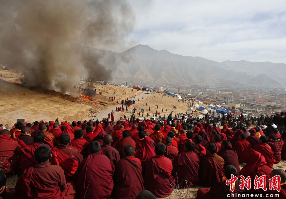 4月17日,青海省玉樹縣結(jié)古鎮(zhèn)附近的山坡上,眾多地震遇難者遺體被火葬。當日,為妥善及時處理遇難人員遺體,預防災區(qū)疫情的發(fā)生與流行,青海出臺地震遇難人員遺體處理意見,強調(diào)在處理遺體時要尊重少數(shù)民族喪葬習俗,尊重死者尊嚴。圖為眾多僧侶為逝者祈禱。中新社發(fā) 盛佳鵬 攝