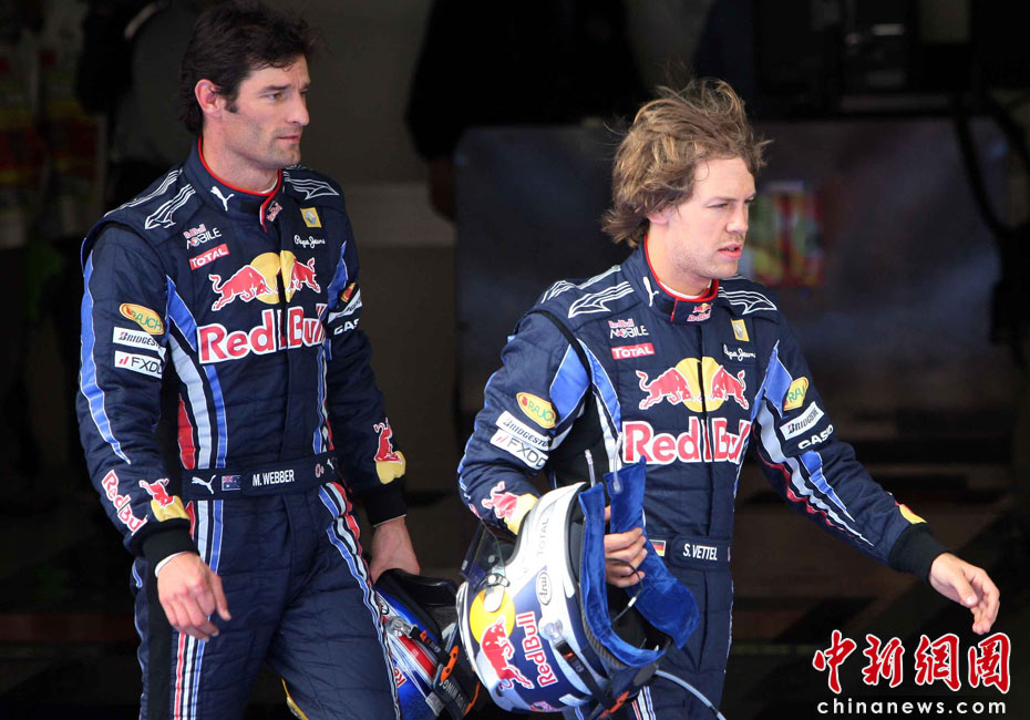 4月17日下午,2010國際汽聯(lián)F1世界錦標(biāo)賽上海站在上海國際賽車場(chǎng)舉行排位賽,代表紅牛車隊(duì)出戰(zhàn)的德國車手維特爾(右)獲得桿位,隊(duì)友、澳大利亞車手韋伯獲得第二名,法拉利車隊(duì)的西班牙車手阿隆索獲得第三名。中新社記者 任晨鳴 攝