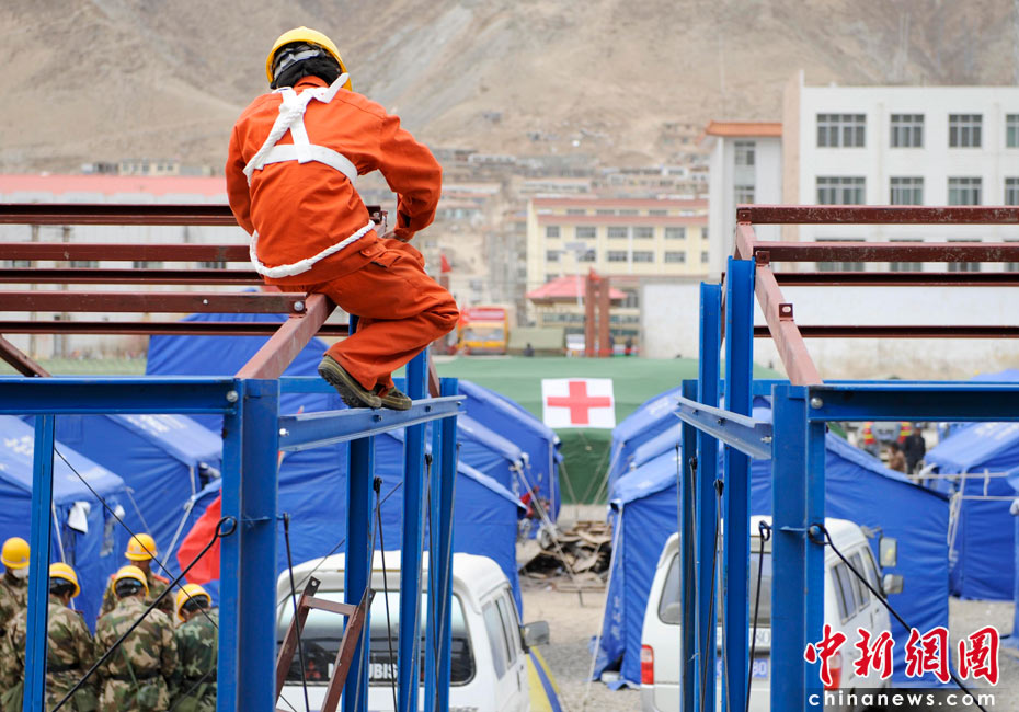 4月17日,青海玉樹體育場受災(zāi)民眾安置點(diǎn),工人們安裝臨時(shí)板房。中新社發(fā) 廖攀 攝