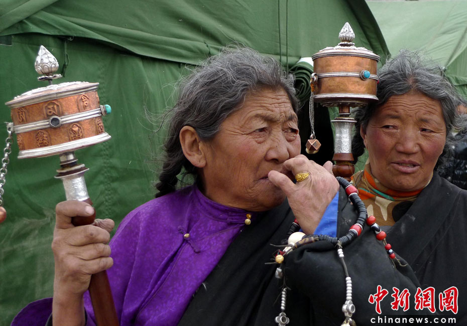 4月17日傍晚,玉樹(shù)震區(qū)街頭,兩位藏民轉(zhuǎn)經(jīng)祈福。中新社發(fā) 孫自法 攝