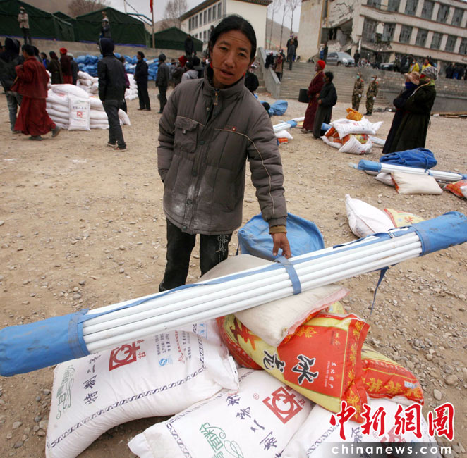 4月17日,大批救災物資抵達青海省玉樹地震災區(qū),當地政府及時組織將救災帳篷和糧食分發(fā)到災民手中。圖為玉樹清水河鄉(xiāng)的受災民眾領到全家的救災物資糧食和帳篷。中新社發(fā) 劉忠俊 攝