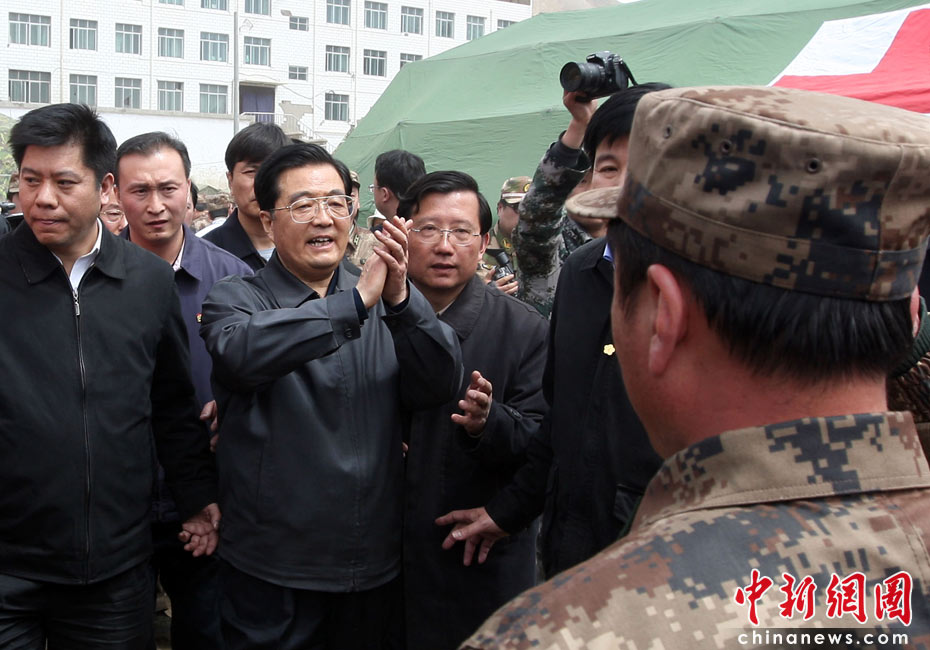 4月18日,中共中央總書記、國家主席、中央軍委主席胡錦濤飛抵玉樹,看望慰問地震災區(qū)干部群眾,實地指導抗震救災工作。中新社發(fā) 盛佳鵬 攝