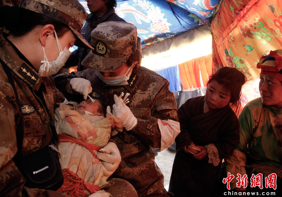 4月18日,總后青藏兵站部抗震醫(yī)療隊在青海玉樹震中結(jié)古鎮(zhèn)展開救援的同時,還派員向周邊牧區(qū)巡診,救治傷病員。圖為醫(yī)務(wù)人員為黃林格頭牧區(qū)索南求幾的嬰兒進行檢查和護理。據(jù)悉,這個牧區(qū)所有房屋在地震中被損毀,不少牧民在地震中受傷,目前住在搭建的帳篷里。中新社發(fā) 鄒小慶 攝