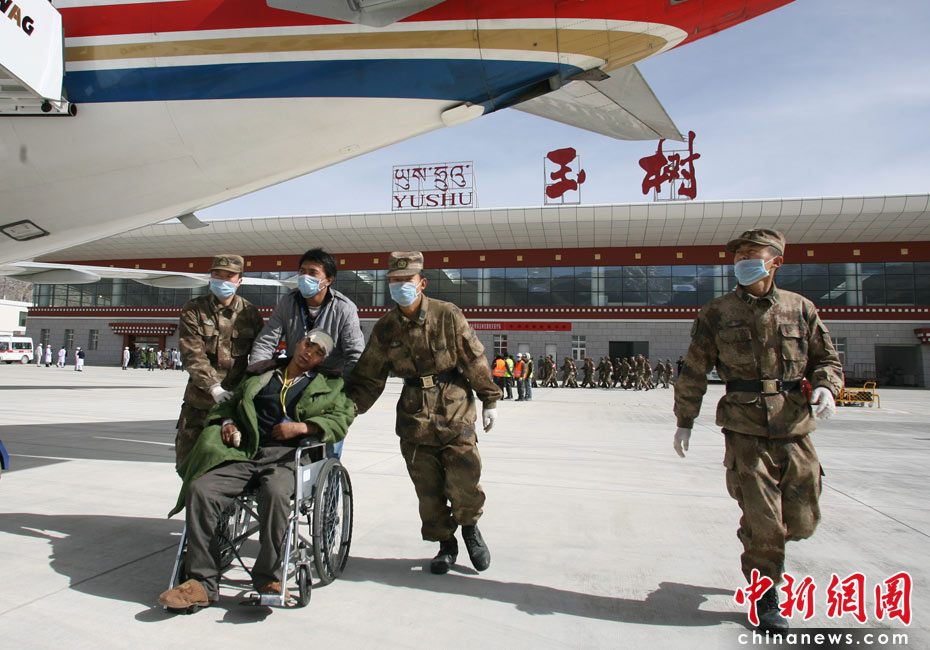 4月18日,青海省軍區(qū)救援隊在玉樹機場運送傷員。中新社發(fā) 蘇丹 攝