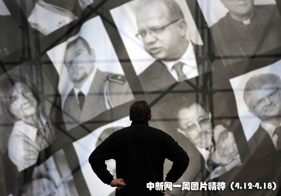 一個(gè)人在波蘭空難受害者遺像前默哀。