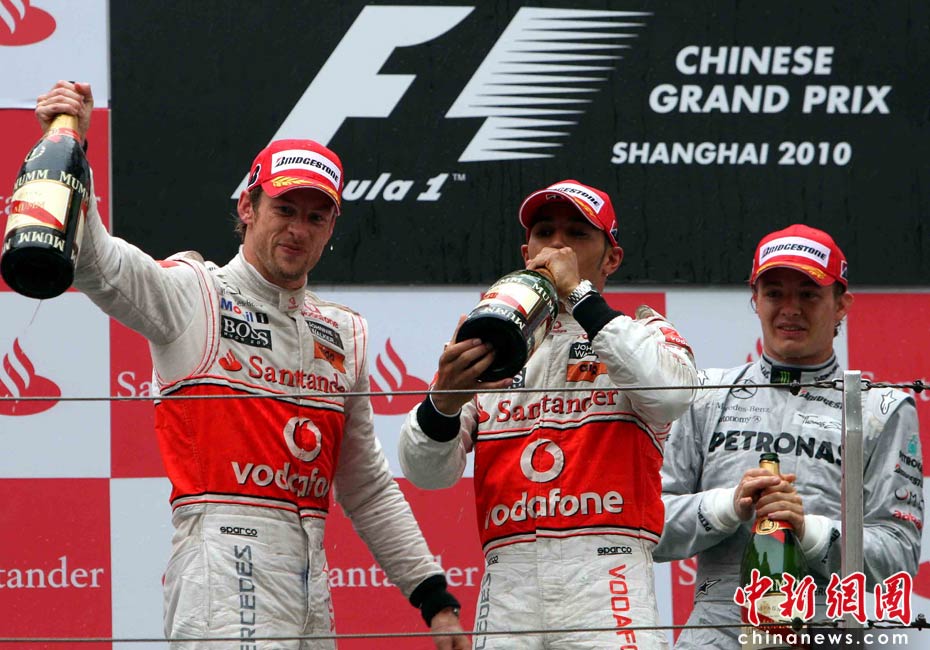4月18日下午,2010國際汽聯(lián)F1世界錦標賽上海站在上海國際賽車場舉行正式比賽,邁凱輪車隊的英國車手巴頓(左)在雨中獲得冠軍、隊友、英國車手漢密爾頓(中)獲得亞軍,梅賽德斯GP車隊的德國車手羅斯伯格獲得季軍。中新社記者 任晨鳴 攝